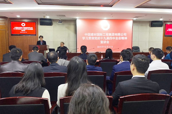 为贯彻落实中国建材集团党委《关于做好党的十九届四中全会精神学习宣传工作的通知》、集团党群工作部《关于在第二批“不忘初心、牢记使命”主题教育中认真学习贯彻党的十九届四中全会精神的通知》,12月10日,中国建材国际工程集团有限公司召开学习宣传贯彻党的十九届四中全会精神宣讲会,组织党员干部、工会干部、共青团干部和职工代表进一步学习全会精神。