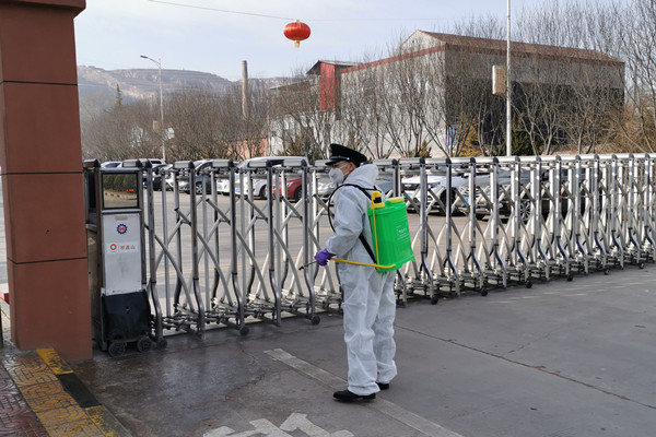 “尽管疫情已经得到了有效控制,但是我们的疫情防控和安全监管工作还是一刻不能放松。”王洲是平凉公司综合办公室的一名门卫,每天负责公司进出人员的登记和厂区的消毒工作,他背着装有消毒液的药箱,对厂门进出口、区域内垃圾桶、水渠、重点区域仔细进行喷洒。每次消毒大约需要一个多小时,消毒结束后,刚好也到了上班时间,王洲又回到门卫处,对进出的人员、车辆进行登记,“体温36.7,正常。请登记下具体信息。”距离下班前一个小时,王洲再次穿戴好防护用品,背起消毒箱开始第二次消毒工作……