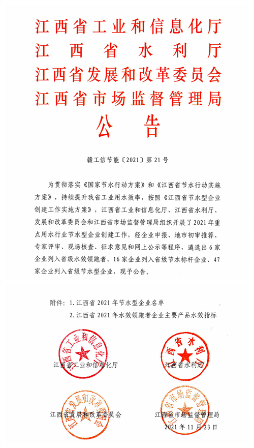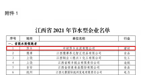 近日,根据赣工信节能〔2021〕第21号文件公告,江西省工业和信息化厅、省水利厅、省发展和改革委员会、省市场监督管理局共同遴选出6家省级水效领跑者企业,中材萍乡既是江西省唯一一家入选的水泥企业,也是萍乡市首家成功入选的企业。