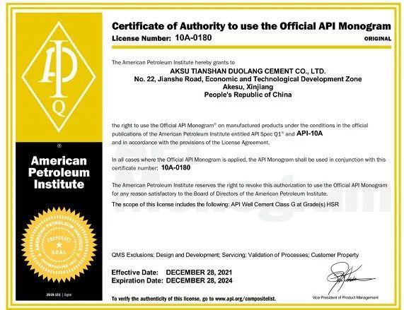 阿克苏天山公司成功取得由美国石油协会颁发的“API Q1油井水泥体系认证证书。”APIQ1油井水泥体系认证证书的殊荣,是公司在技术创新、质量管控上一个质的飞跃,公司将严格执行API组织发布的石油设备技术规范生产油井水泥,增加产品结构,拓宽水泥销售市场,提高市场占有率,将优质的产品提供给客户,为公司绿色健康可持续发展奠定坚实基础。