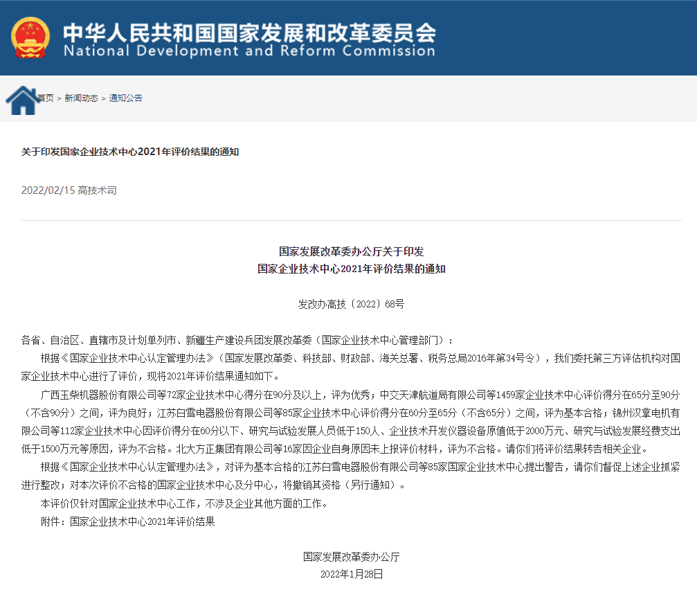 近日,国家发展改革委等部门正式发布2021年(第28批)新认定国家企业技术中心名单及全部国家企业技术中心名单,并公布《关于印发国家企业技术中心2021年评价结果通知》。本次评价从创新投入、创新条件、创新绩效三个维度进行,中国建材股份有限公司所属企业中材科技股份有限公司在2021年度评价结果为优秀,连云港中复连众、中国巨石、天津水泥院、泰山玻纤及下属邹城公司、嘉华水泥、北新集团建材股份、天山股份等8家评价结果为良好。