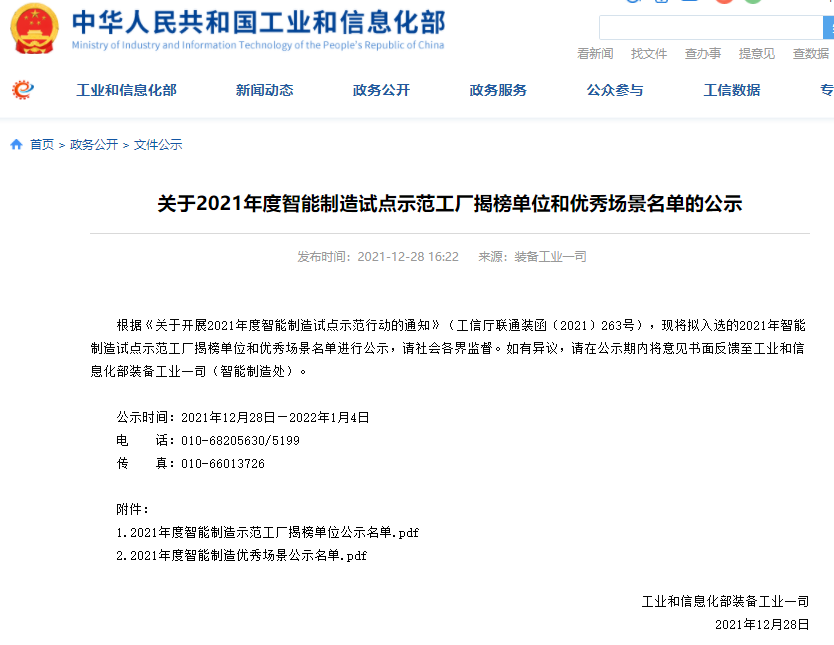 1、多家企业入选2021年度智能制造试点示范工厂揭榜单位和优秀场景名单