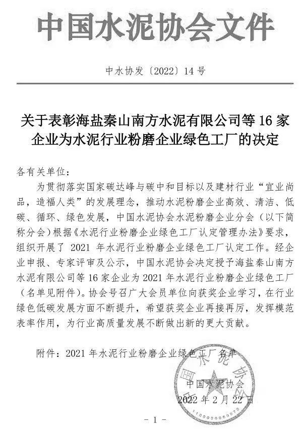 3、所属企业荣获中国水泥协会颁发“2021年水泥行业粉磨企业绿色工厂”荣誉称号
