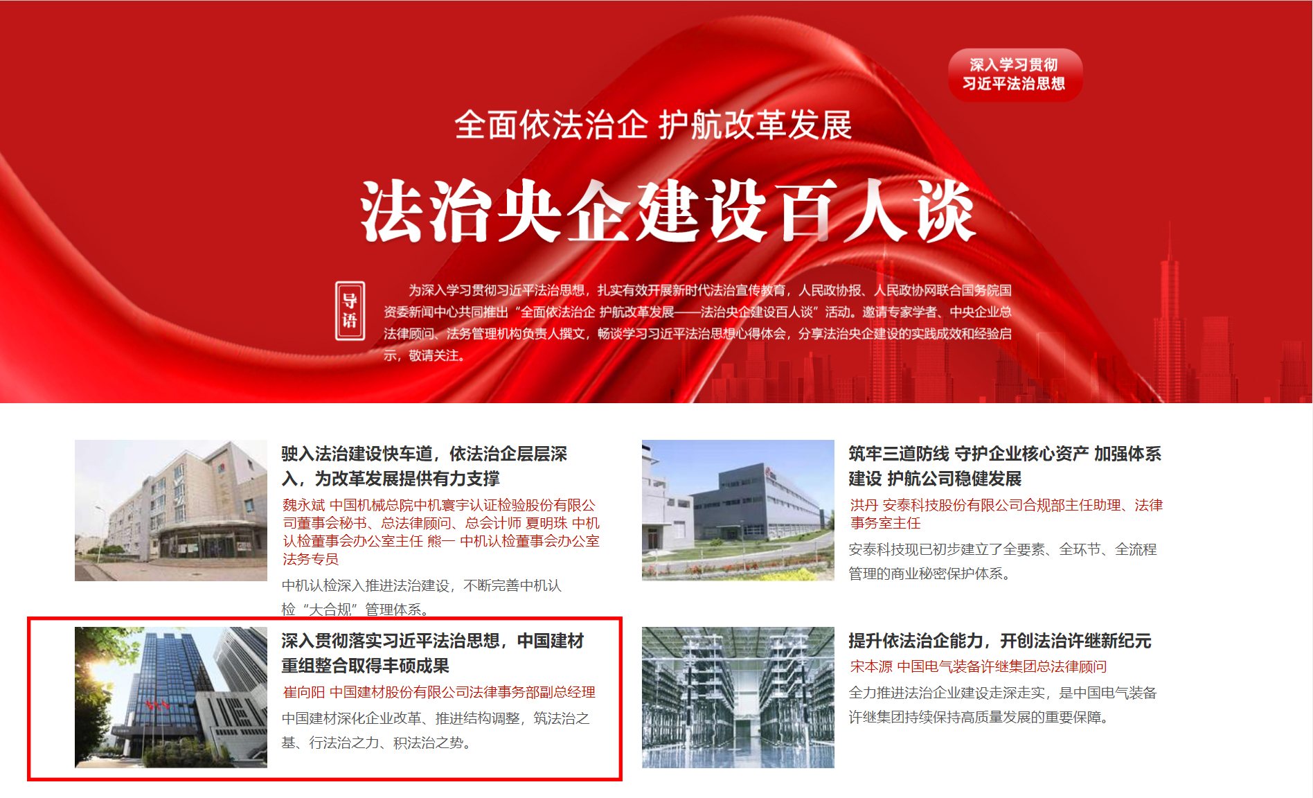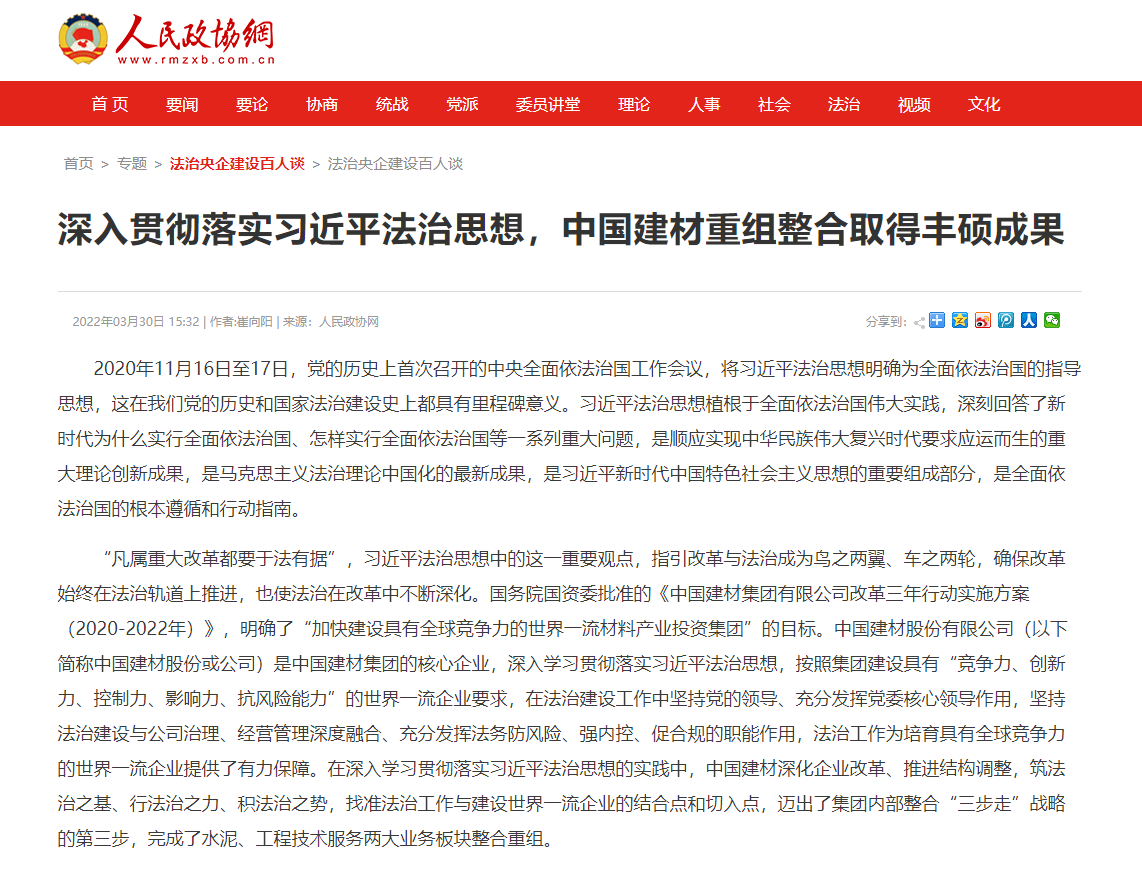 为深入学习贯彻习近平法治思想,扎实有效开展新时代法治宣传教育,人民政协报、人民政协网联合国务院国资委新闻中心共同推出“全面依法治企 护航改革发展——法治央企建设百人谈”活动。3月30日,由中国建材股份法律合规部撰写的《深入贯彻落实习近平法治思想,中国建材重组整合取得丰硕成果》在人民政协网与国资委网站该专题栏目中刊登。